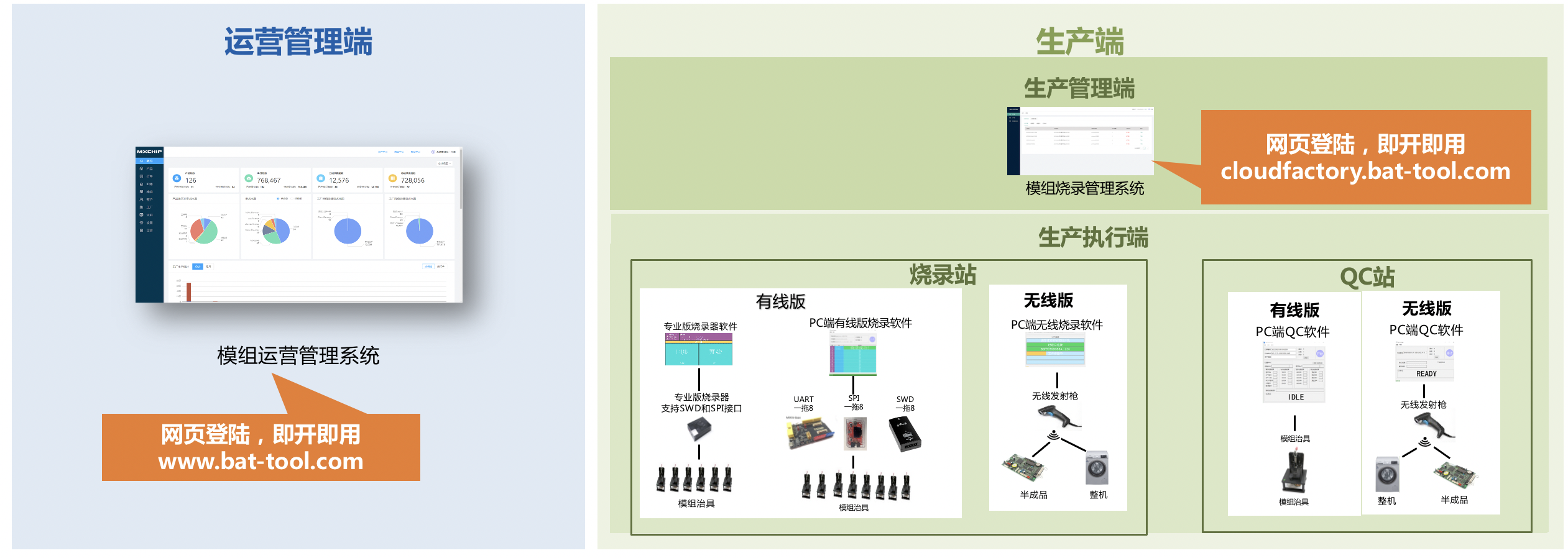 系统通过两端一体的服务模式,帮助企业实现:模组产品固件及设备激活码ID 的差异化烧录管理。